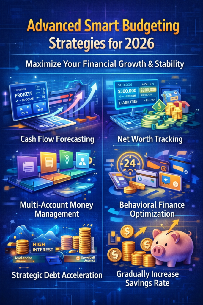Advanced budgeting tips 2026 focus on forecasting, wealth measurement, structured account systems, behavioral discipline, and strategic debt management. When combined with automation and real-time tracking, these strategies create a comprehensive financial framework designed for stability and long-term wealth accumulation.