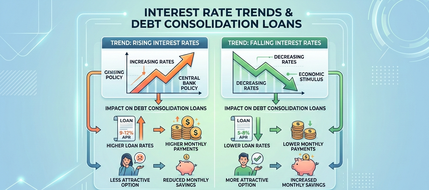 Interest rates directly affect how affordable debt consolidation loans are. When benchmark rates rise, personal loan APRs typically increase. When rates fall, borrowers may qualify for lower-cost options.