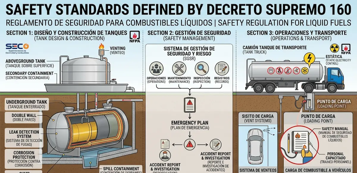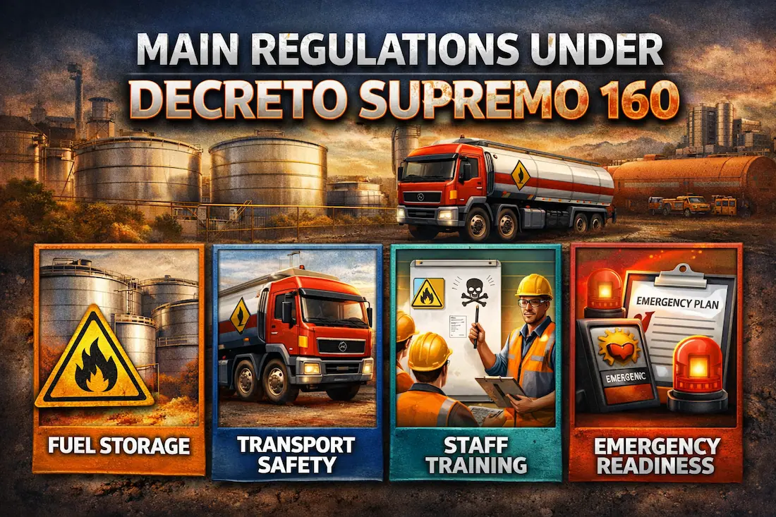 The main purpose of Decreto Supremo 160 is to regulate all aspects of fuel management to reduce risks and protect both people and the environment. This includes: