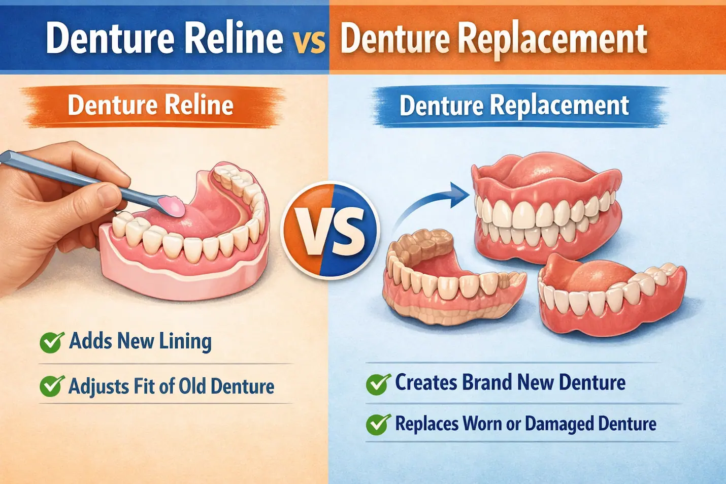 A denture reline is a dental procedure that reshapes the inner surface of a denture so it fits properly against the gums. Over time, natural changes in gum tissue and jawbone structure cause dentures to loosen. This adjustment restores stability, improves comfort, and enhances chewing efficiency without replacing the entire denture.