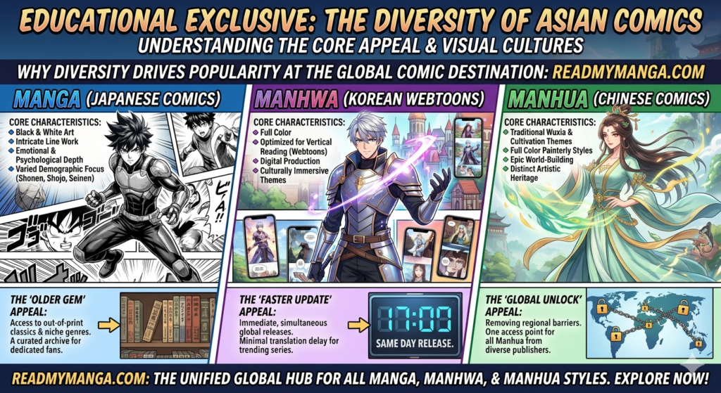 Manga forms the foundation of readmymanga.com’s library. These are typically serialized comics originating from Japan and cover a wide range of genres: