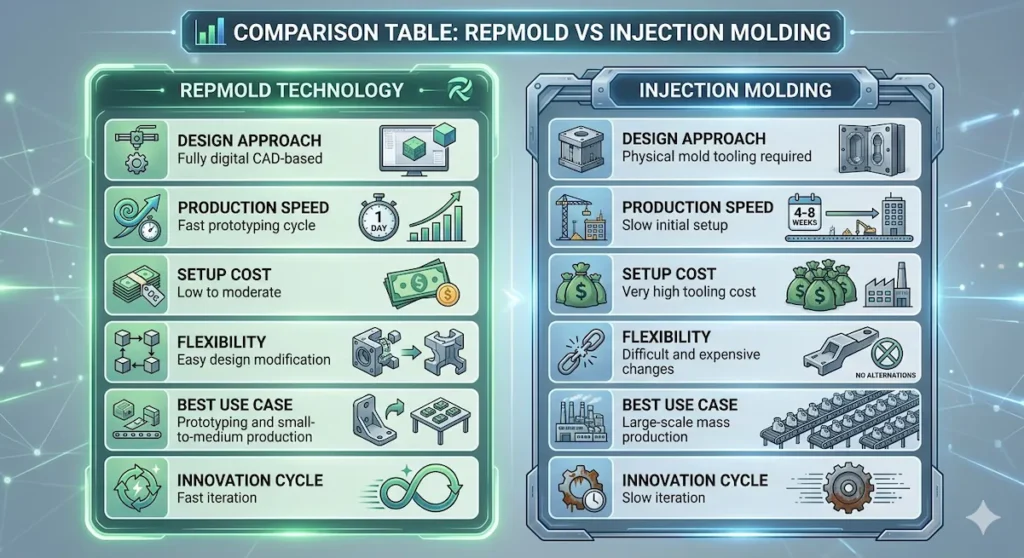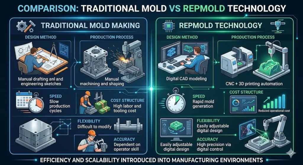 This comparison highlights how Repmold introduces efficiency and scalability into manufacturing environments that previously relied on rigid and time-intensive processes.