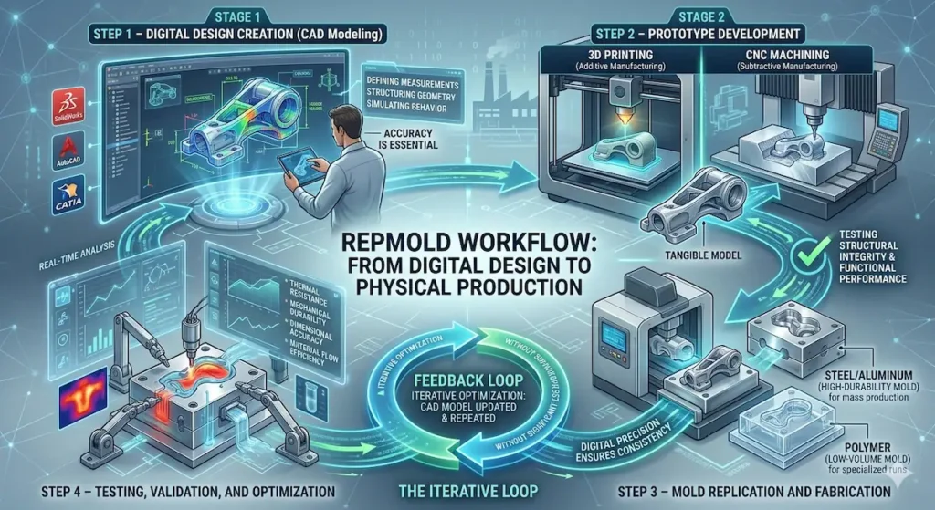 Repmold follows a structured digital-to-physical workflow that converts engineering concepts into usable molds. Each stage plays a critical role in ensuring precision, performance, and manufacturability.