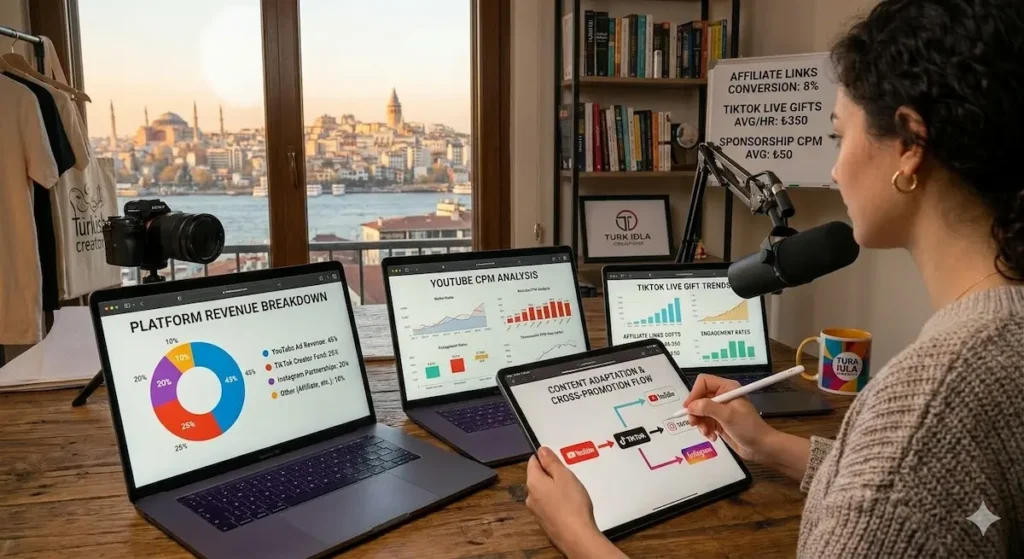 | YouTube | Ad Revenue, Sponsorships, Memberships | ₺10,000–₺25,000 | Stable revenue, long-form content, evergreen videos |